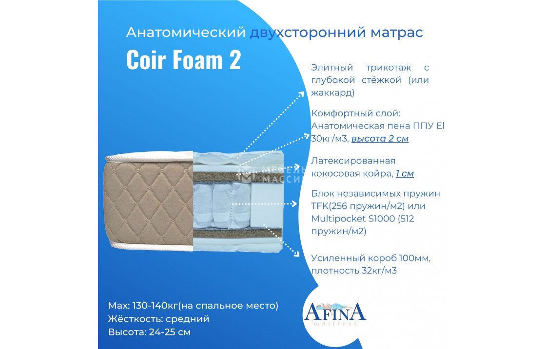 двусторонний Coir Ortofoam 2 / Coir 2 Ortofoam 2 от фабрики афина с пружинным блоком tfk-256 (256 пружин на кв. метр) или multi-512 (512 пружин на кв. метр) на выбор. чехол жаккард стёганный 180-220 гр/м2 или элитный трикотаж с объёмной стёжкой 300гр/м2 на выбор. купите по цене производителя в интернет-магазине мебель массив.| Размер | Цена | |