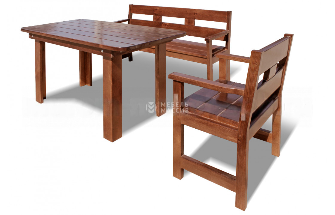 Набор мебели Русич – выгодный вариант для тех, кто не хочет отдельно приобретать несколько предметов. Набор включает в себя стол, лавку и кресло, которые более всего подойдут для размещения в дачном доме. Дизайн всех изделий выдержан в едином минималистичном стиле, в качестве материала изготовления выступает сосновый массив. Данное дерево превосходно переносит высокую влажность, поэтому мебель можно поставить даже на открытой террасе, не боясь растрескивания поверхностей и появления грибков и бактерий. Доставка по Хасавюрту и Республике Дагестан.| Материал | сосна |